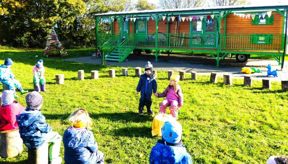 Ein robuster, nachhaltiger, mobiler und beheizbarer Bauwagen (Tiny House) steht den Kindern immer zur Verfügung.Der Bauwagen ist nach den Bedürfnissen des Kindergartens mit Tischen, Bänken, Materialschränken und einer Garderobe ausgestattet sowie bestens wärmeisoliert.