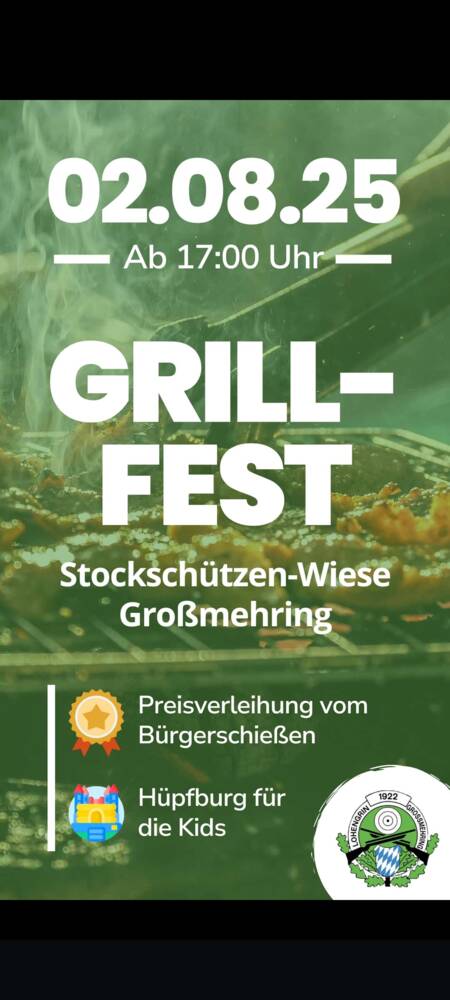 Das Grillfest mit Preisverleihung vom Bürgerschießen des SV Lohengrin Großmehring e. V. findet am Samstag, 02. August 2025 ab 17:00 Uhr auf der Wiese bei den Stockschützen statt.