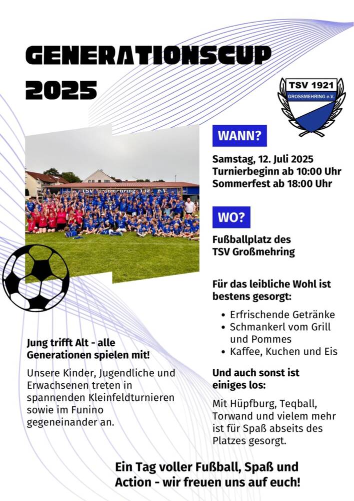 Die Fußballabteilung des TSV Großmehring 1921 e. V. veranstaltet am 12. Juli 2025 wieder einen Generationscup am TSV Sportgelände.